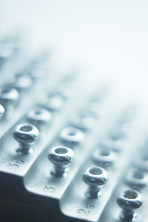 Orthopedics and Traumatology surgery rack of screws to fix surgical titanium metal implants close-up isolated photo.
