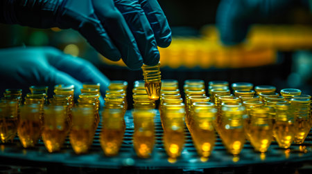 Technician is placing amber vials in neat rows on a workstation, showing precision in laboratory settings with focused attention.