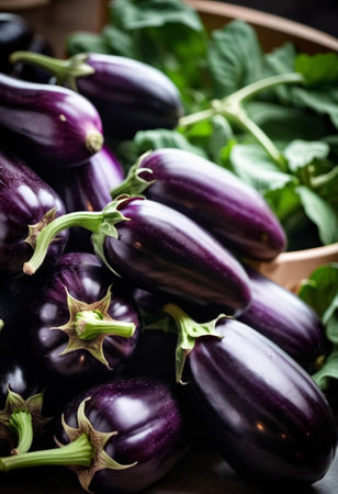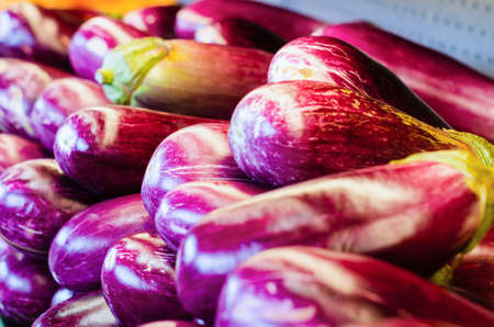 New harvest of tasty ripe purple eggplants vegetables in Italy
