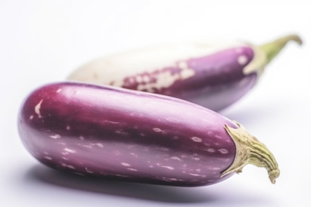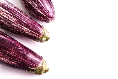 Close up of Eggplants on white background with copy space. Healthy vegan vegetarian food concept.