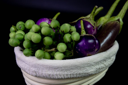 The assortment of several type of vegetable, fresh eggplants, Green pea eggplants and Round eggplants on Black Background