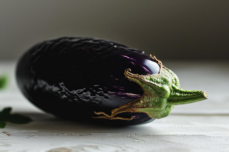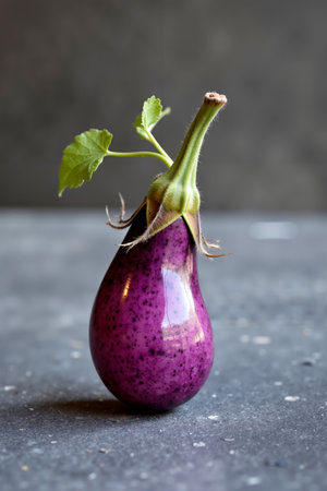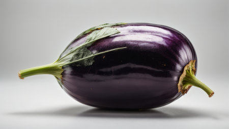 A vibrant eggplant rests elegantly on a neutral backdrop, highlighting its unique patterns and colors. Ideal for culinary and food photography.