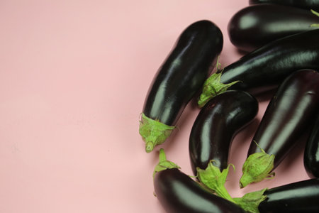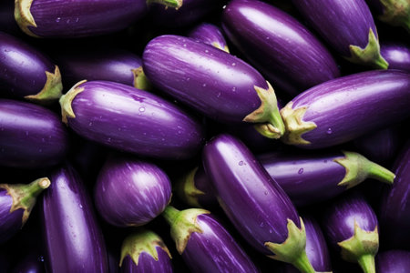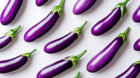 A group of eggplant are arranged in a pattern on the white surface, AI