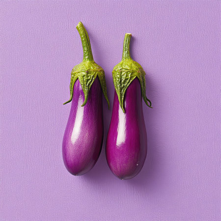Two vibrant eggplants sit elegantly against a soft purple background, perfect for showcasing healthy cooking, fresh ingredients, or food styling ideas.
