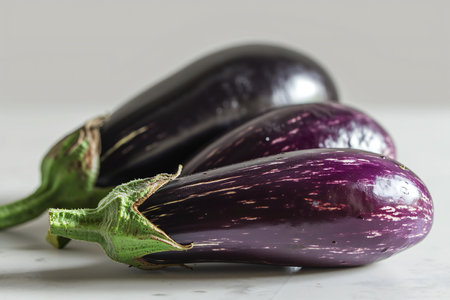Vibrant aubergines neatly arranged on a clean white surface show their freshness.