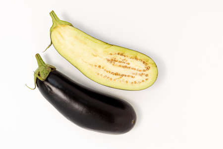 eggplant or aubergine with half isolated on white background, fresh vegetables, top view
