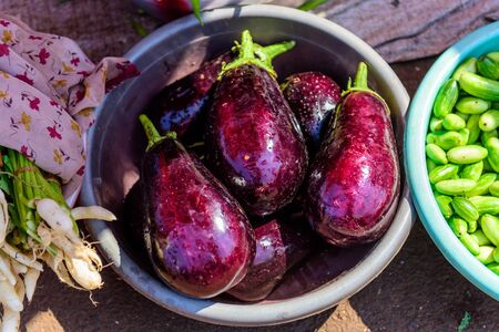 Variety of fresh eggplant vegetables, white, graffiti, purple, round eggplant Violet