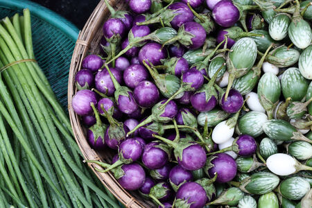 Various types of eggplant, aubergine, green eggplant, white eggplant, purple eggplant in the market.