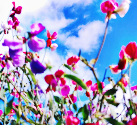 Blurred background of pink and purple sweet pea flowers with blue sky