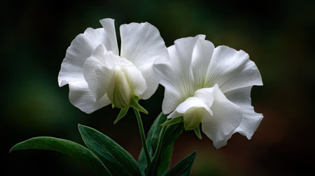 Close-up image of two white sweet pea blossoms, exhibiting intricate details of the petals and stem, against a dark, out-of-focus background. The lighting and focus highlight the delicate textures and beauty of the flowers.