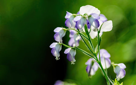 Close-up of purple and white wild flowers on a green background