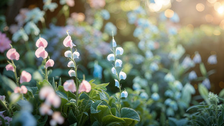 A serene garden scene featuring delicate pink flowers in soft focus, exuding tranquility and beauty. This image captures the essence of spring and nature's elegance.