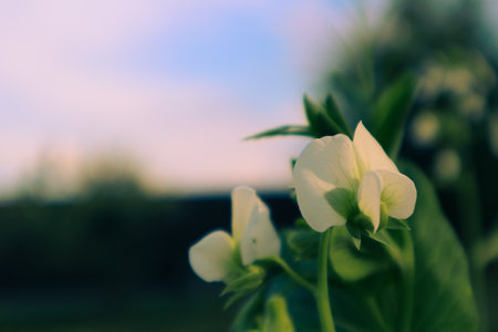 Close-up of delicate white pea flowers blooming on a healthy pea plant, thriving in a vibrant garden setting
