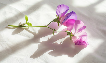 A stunning close-up of delicate purple flowers on a textured soft fabric, creating a serene and elegant indoor atmosphere enhanced by natural light.