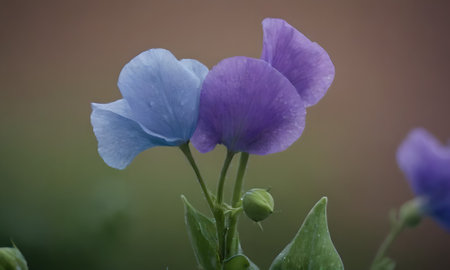 Capture the essence of tranquility with this stunning close-up of sweet pea flowers in soft hues of peach and pink, beautifully set against a cool blue background.