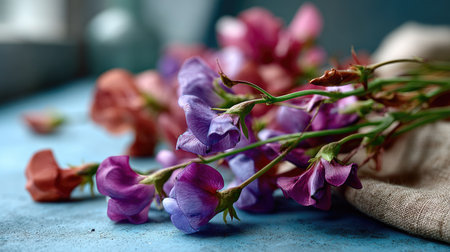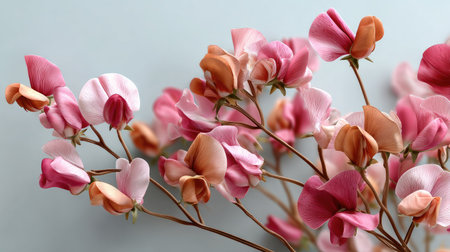 A stunning depiction of freshly cut sweet pea flowers, showcasing their vibrant colors against a soft blue background, perfect for floral enthusiasts.