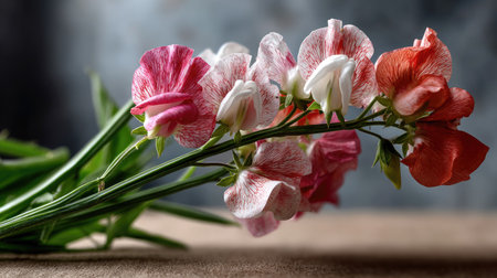 A beautiful arrangement of colorful sweet pea flowers showcasing various shades, arranged artistically against a rustic background, creating a serene atmosphere.