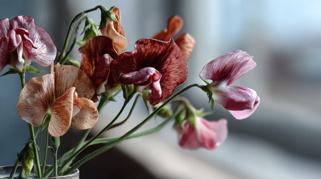 A stunning arrangement of sweet pea flowers in shades of pink, red, and orange elegantly displayed. The blurred background adds depth, enhancing the beauty of this bouquet.