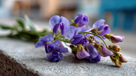 A captivating arrangement of beautiful purple sweet pea flowers on a rustic background, showcasing intricate petals and leaves. Perfect for nature lovers.