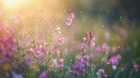 A serene meadow filled with delicate pink flowers illuminated by soft sunlight, creating a tranquil atmosphere with floating petals dancing in the breeze.