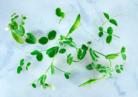 Green pea shoots, front view and close up. Microgreens and young plants of Pisum sativum. Seedlings and sprouts, used as garnish or as leaf vegetable. Edible, raw, organic and vegan. Macro food photo.
