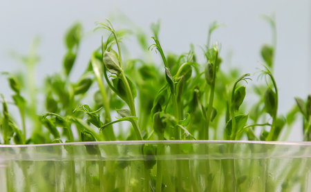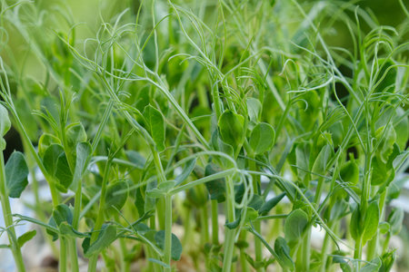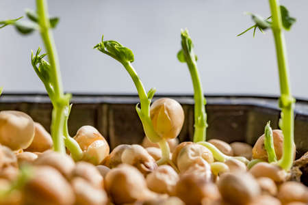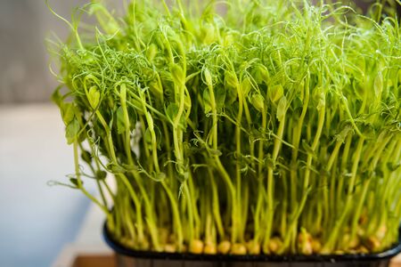 Close-up of peas microgreens. Growing microgreen sprouts close up view. Germination of seeds at home. Vegan and healthy eating concept. Sprouted seeds, micro greens.