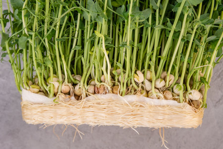 Peas microgreens with seeds and roots. Sprouted peas Seeds. Sprouting Micro greens. Seed Germination at home. Vegan and healthy eating concept. Growing sprouts. Green living concept. Organic food.