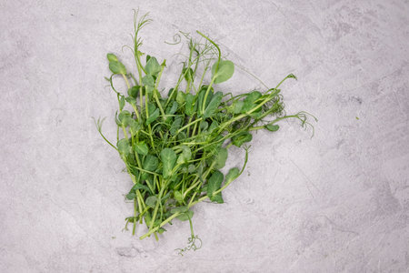 Green sprigs of sprouted grains. Organic, vegan healthy food concept. Eating right, stay young and modern restaurant cuisine. Fresh micro greens peas sprouts. Young vegetable pea sprouts, micro greens
