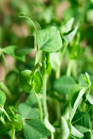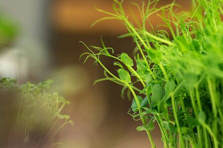 Environmentally friendly food. Pea microgreens close up with sun glare.