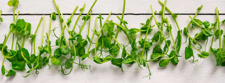 Food background. Healty eating. Young sprouts of fresh peas on white wooden background. Banner