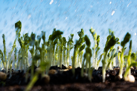 Gremination of peas against blue sky.