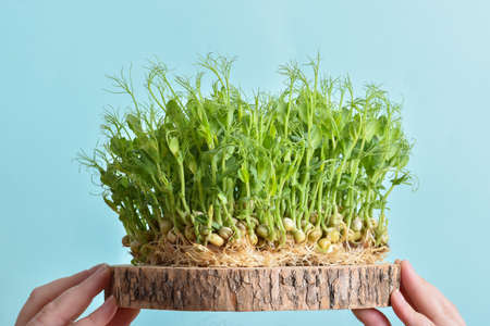 Close-up of female hands holding a wooden substrate with micro-green peas on a light blue background. Home garden on the windowsill. healthy eating. Vegetarianism. Diet.