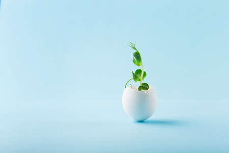 Green sprout in white egg on blue background. Selective focus, copy space.