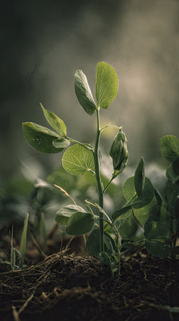 Sweet pea with small fresh leaves, growing upright in fertile soil, sunlight filtering gently, realistic textures, vibrant green tones, natural photography style, wide balanced composition