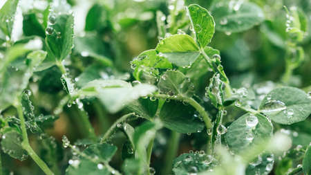 Close-up of peas microgreens green leaves sprouting with drops of water in frozen motion. Micro greens in a pot. Sprouts of green peas. super food.