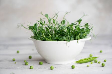 fresh microgreens of young peas in a white bowl