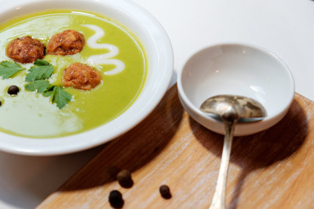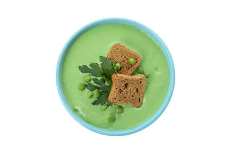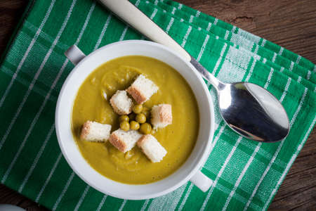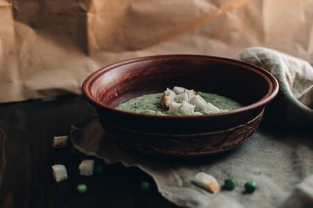 Green cream vegetable soup broccoli, peas, zucchini, spinach with croutons. Delicious vegetarian healthy food.