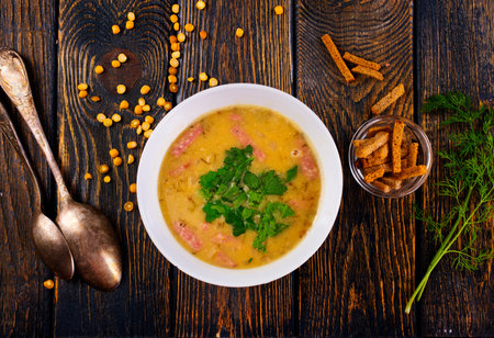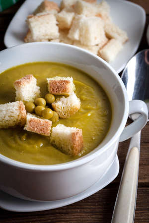 Pea soup-puree on a light wooden background. Horizontal orientation. Place for a copy space