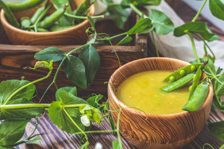 Wooden plate of pea soup and pods of fresh green peas on a dark wooden surface. Vintage wooden surface for design with beautifully located pods of green peas. Shallow depth of field.