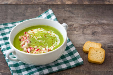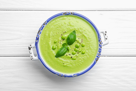 Fresh vegetable detox soup made of green peas and spinach in dish on table, top view