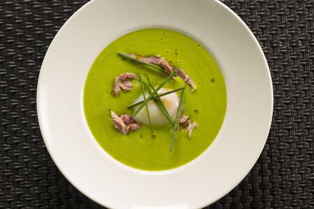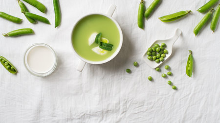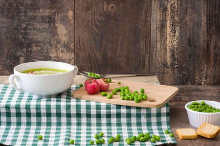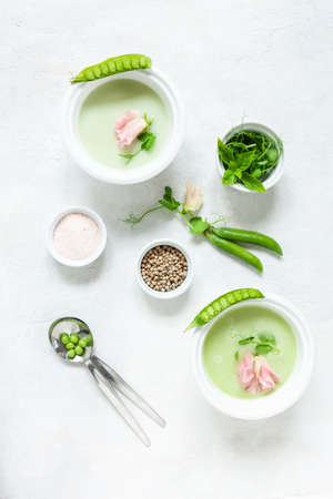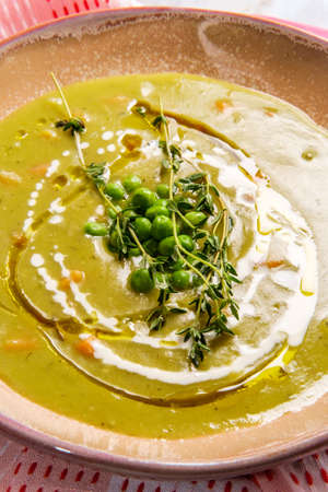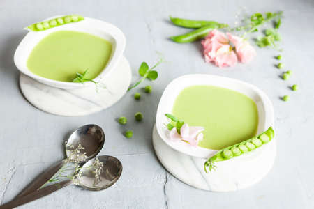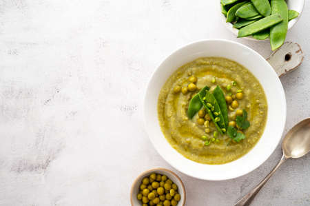 Green cream soup with green fresh peas on bright background. Healthy, vegan foods