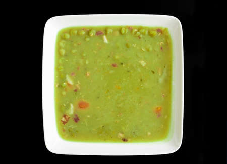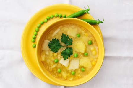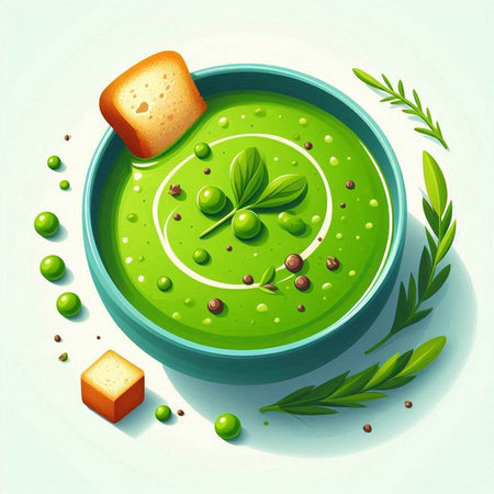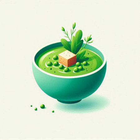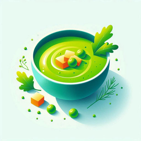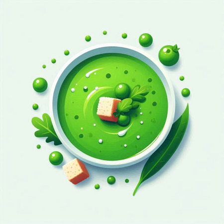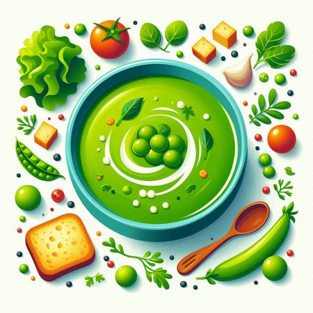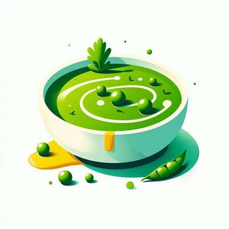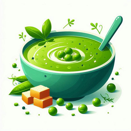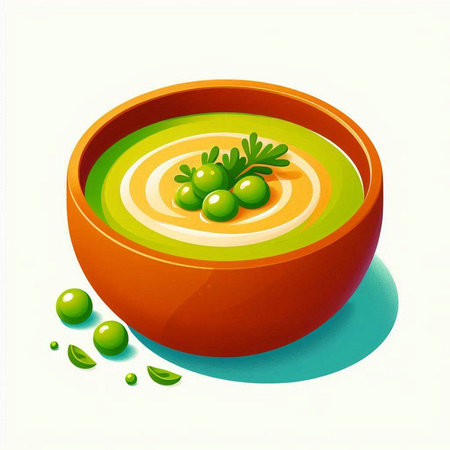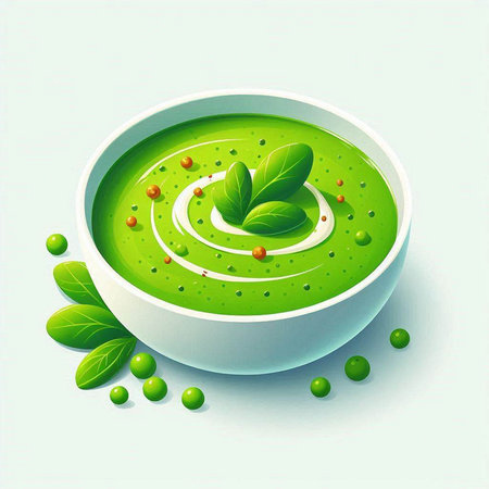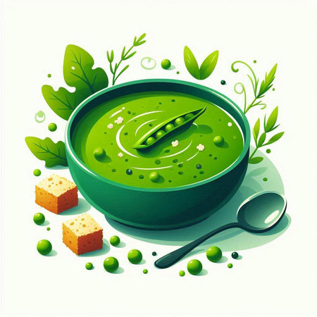 Vector illustration of fresh vegetable soup with green peas in a bowl.
