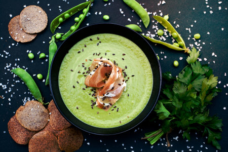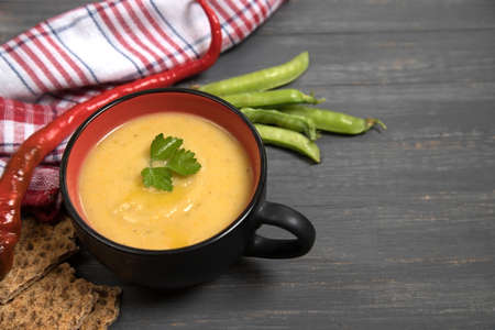 A Cup of pea soup and vegetable pods on a dark wooden background with whole grain crackers. Place for a copy space