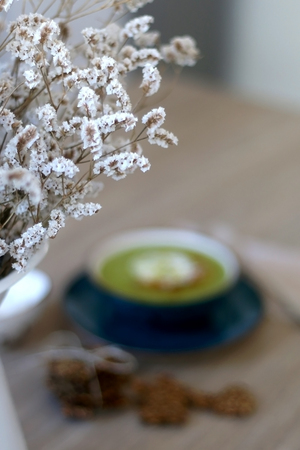 Vase with small white flowers on a table. Vegetable soup in the background. Selective focus.