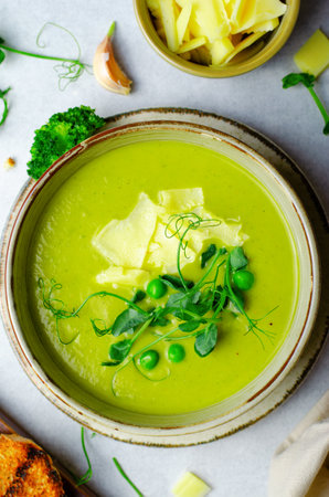 Pea Soup with Green Vegetables, Broccoli and Pea Sprounts with cheese on bright backround, Healthy Eating