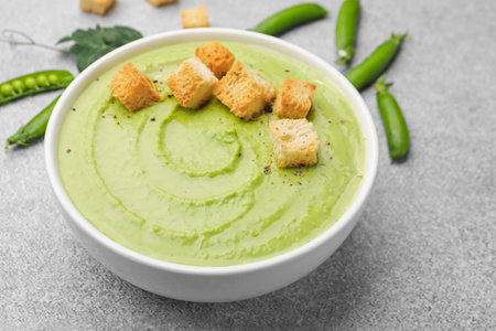 Tasty pea cream soup with croutons on grey table, top view. Space for text