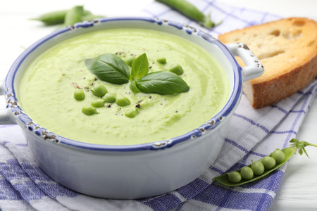 Tasty pea cream soup with basil served on white wooden table, closeup
