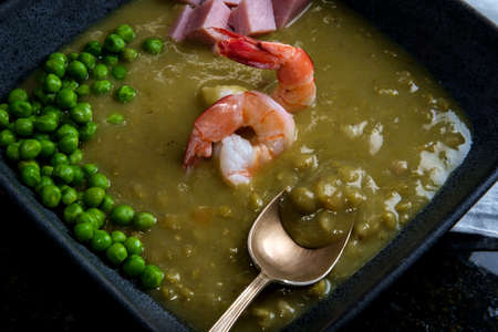 Pea soup with pieces of bacon, parsley and onion in a bowl on a dark background. Pea cream soup.