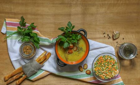 cream soup of different varieties of peas and lentils with croutons and parsley in a black saucepan on a linen towel with bread sticks on a wooden surface, top view