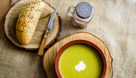 Creamy broccoli and green pea soup with mint, delicious healthy lunch